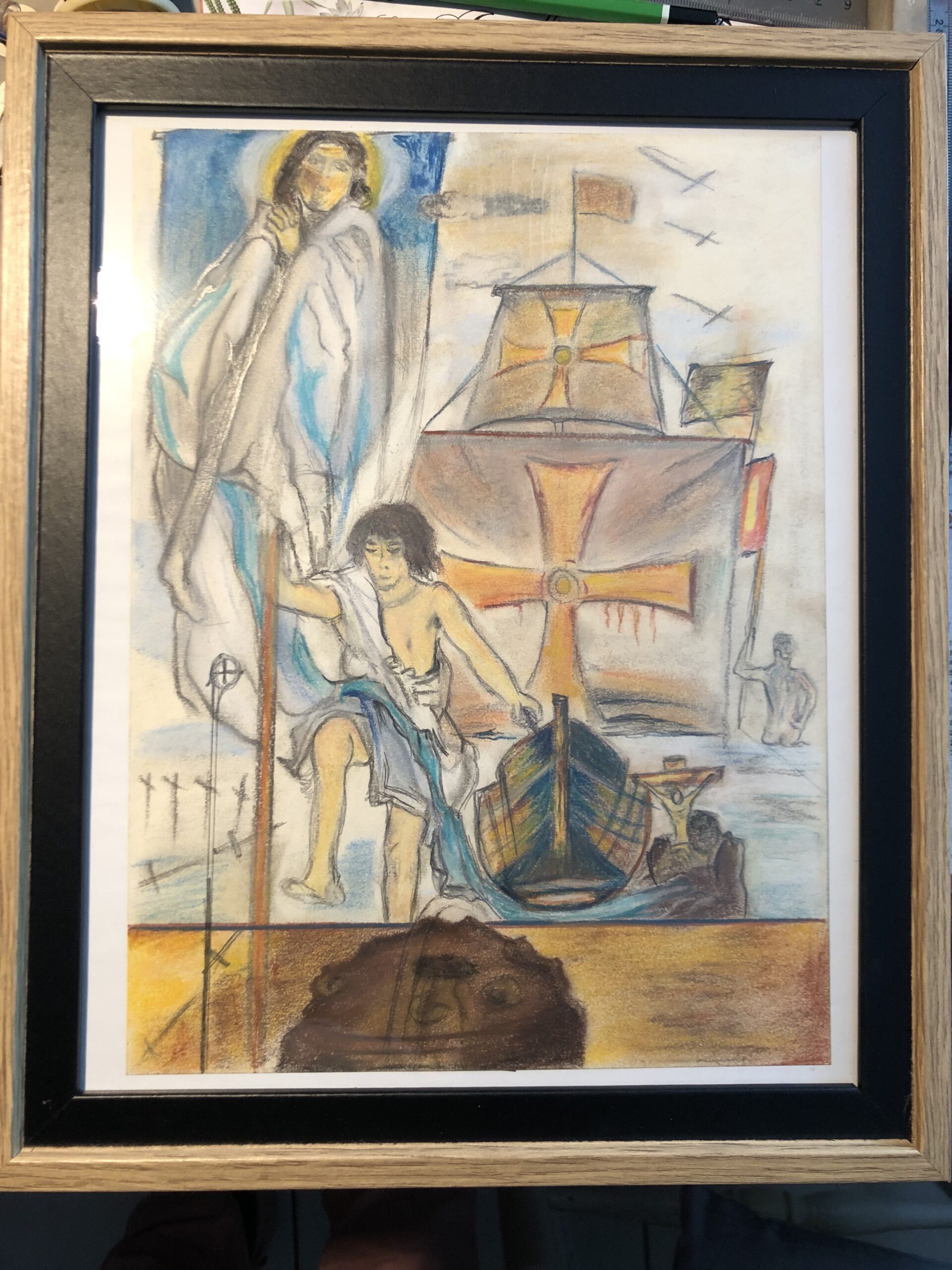Ce dessin, inspiré du célèbre tableau « Le Christ de Saint Jean de la Croix » de Salvador Dalí, présente une scène riche en symbolisme religieux. Au premier plan, une figure humaine drapée de blanc semble représenter le Christ, évoquant à la fois une présence divine et une rédemption transcendante. Son visage tourné vers le ciel rappelle un moment d’extase spirituelle, ou peut-être une réflexion sur la souffrance et le salut.